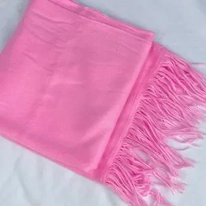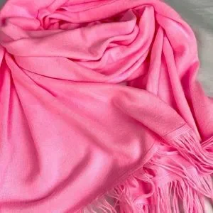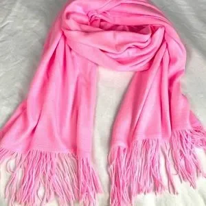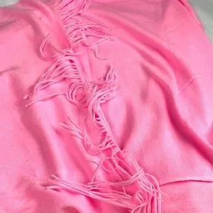 This scarf is so buttery soft and the tassels feel amazing. The scarf has a lovely Barbie Bubblegum pink color to it. Cashmere feel, could be cashmere actually. When I purchased it, it was pretty expensive. It did have fur accents on it, which I promptly removed.