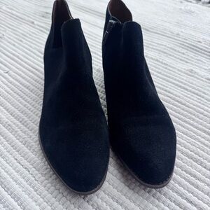 lucky brand booties, black suede ankle boots, stacked heel booties, minimalist shoes women, capsule wardrobe shoes, fall ankle boots, size 8 booties women, everyday ankle boot