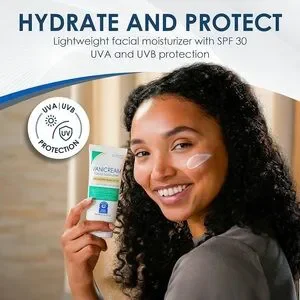 Facial Moisturizer delivers daily hydration with broad spectrum SPF 30 sun protection. Formulated for sensitive skin and free of dyes, fragrance, lanolin, parabens, and formaldehyde releasers. Lightweight, non-comedogenic formula with zinc oxide and ceramides. Green packaging shown.