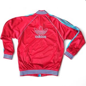 1980s Made In USA “Adidas” track jacket. Red with shiny baby blue stripes down arms and on collar, cuffs, and waist.