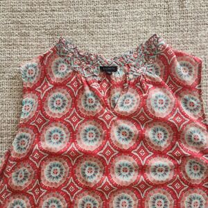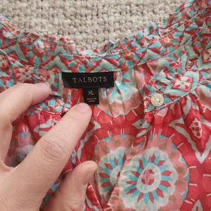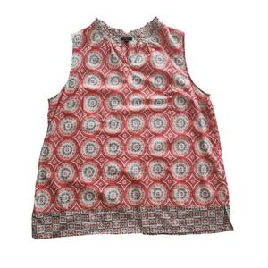 Talbots Womens XL Red Blue Medallion Print Sleeveless Cotton Ruffle Neck Blouse