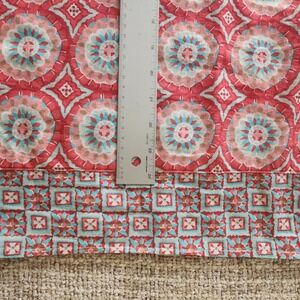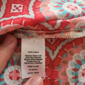 Talbots sleeveless cotton top features a vibrant red and blue geometric medallion print with a contrasting border hem. Designed with a ruffled split neckline and a single button closure, this lightweight piece offers a classic fit perfect for warm-weather styling. The breathable 100% cotton fabric ensures comfort, while the intricate pattern adds a sophisticated touch to any casual or office ensemble.