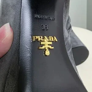 PRADA Gray Suede Platform Boot. Side zip closure. Gold tone hardware. Tonal stitching. Leather interior. Made in Italy.