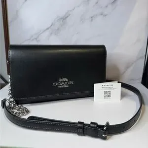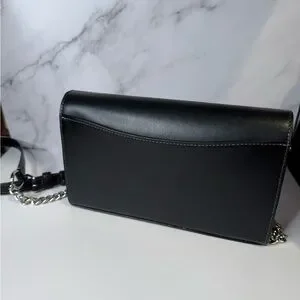 Pre-owned and in like new condition — this sleek Coach bag is the perfect everyday or evening piece. Crafted from smooth black leather with silver-tone hardware and the classic Coach logo on the front. Features a versatile strap with chain detail that can be worn as a shoulder bag or crossbody.