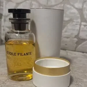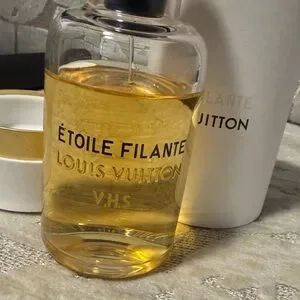 Elegant Louis Vuitton women's fragrance bottle. Clear glass with golden liquid. Black cap and gold-accented packaging. Refined presentation for display or collection.