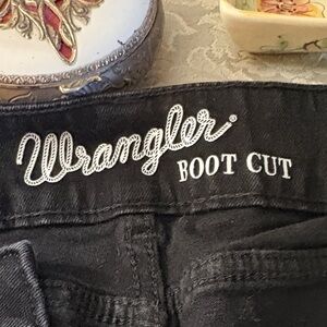 Sleek black boot cut jeans by Wrangler. Perfect for versatile styling. Comfortable and timeless design.