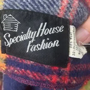Vintage wool blend with vibrant red, yellow, and navy pattern. Accented with gold button closure. Two openings for arms. Stand up collar, unlined. Maybe a pill here or there due to age, but no stains.