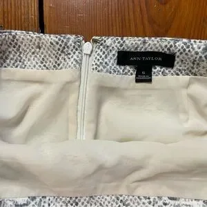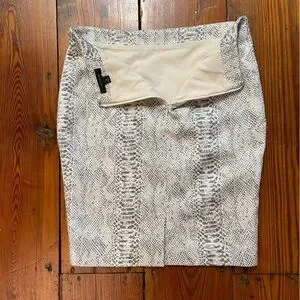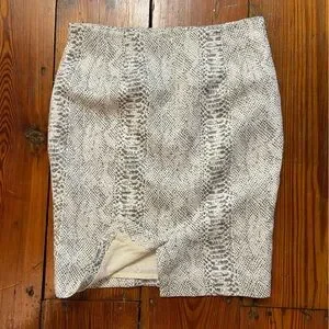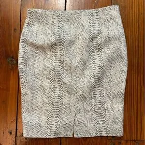 Ann Taylor pencil skirt with subtle snake print. Fitted silhouette with clean lines. Neutral cream and gray palette. Versatile for work or evening. Smooth fabric with slight texture.