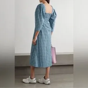 Ganni Seersucker Gingham Smocked Puff Sleeve Dress Black White Size 34 US 2