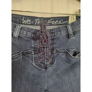 We The Free People Lace Up Dark Denim Jeans Bootcut Raw Hem Rough Size 25. In good preowned condition. No holes, no stains, minor wear.