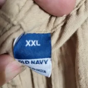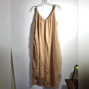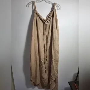 Tan jumper style sleeveless midi dress with drawstring at neckline that ties in the back, side pockets, women's XXL