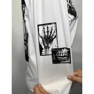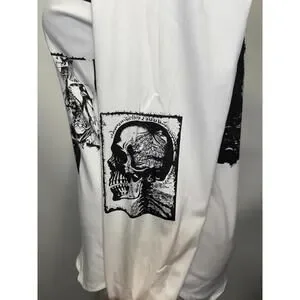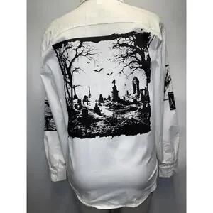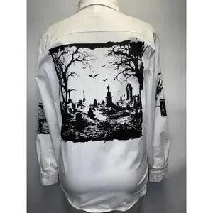 This white, long-sleeve button-up features various graphic patches depicting gothic imagery, including skeletons, graveyards, and anatomical illustrations. It is often sold with a matching black tie.