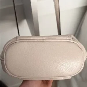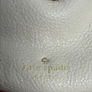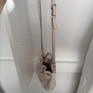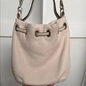 Kate Spade shoulder bucket bag with drawstring closure. Pebbled leather exterior with subtle gold-tone hardware. Single top handle and adjustable strap for carry options. Minimal embossed logo on front. Elegant neutral shade for everyday wear.