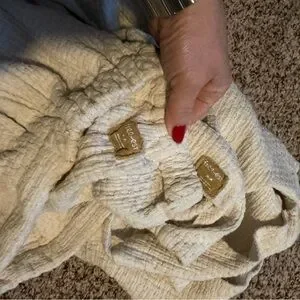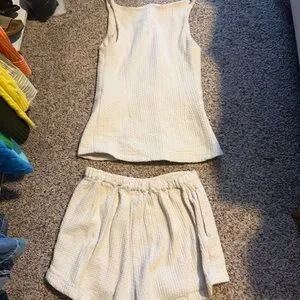 Cream textured knit two-piece set. Sleeveless button-front top with front pockets. Matching short with subtle texture. Elegant neutral color for versatile styling. Worn one time.