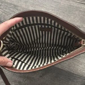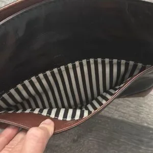 Great bag to be worn crossbody or over shoulder. Black and white liner. Bottom can zip for more room.