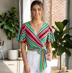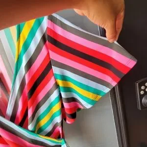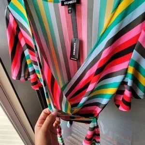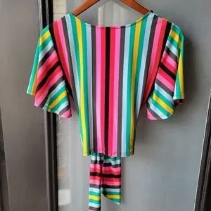 Express Spring Colorful Striped Blouse W/Strap Size S/P Short Sleeve V Neck NWT