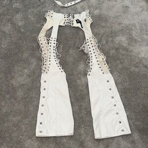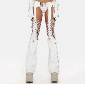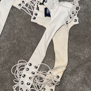 Stylish white lace-up pants. Features eyelet details. Perfect for a bold look. Top S, Bottom XS