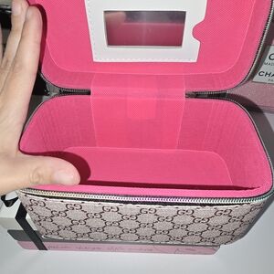 Chic Gucci cosmetic case with pink GG monogram. Features a secure zipper and sturdy handle. Ideal for travel or daily use.