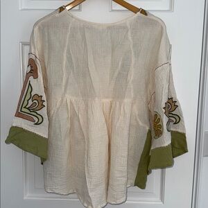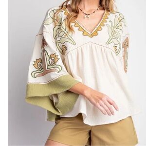Embroidered Gauze Babydoll Top in Cream, Olive, Taupe.