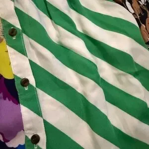 A bold, fashion-forward women's button-down featuring green and white diagonal stripes paired with vibrant blue floral panels. Lightweight fabric with patterned long sleeves for dynamic contrast. Easy to style for day-to-night looks. Available in green, blue, white, brown accents.