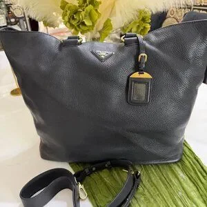 Soft pebbled leather with classic Prada triangle logo and gold hardware. Roomy and perfect for everyday use, work or travel.