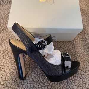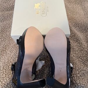 Coach black leather slingback heels with adjustable buckle straps. Smooth leather upper and secure ankle strap for comfortable wear. Versatile black color works with day or evening outfits. Stylish metal buckle accents add a refined touch.