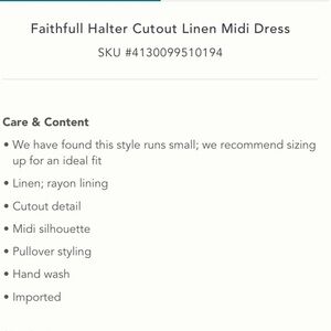 Anthropologie NWT Faithfull Halter Cutout Linen MIDI Dress Size 6. The tag indicates size 8. This dress runs small.