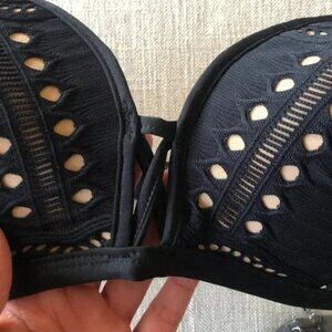 This Bandeau Top in black lace is crafted from a stretch ribbed fabrication with eyelet lace and a contrast mesh trim. Strapless, with soft moulded cups for comfort. It also features a cut-out cross-front feature. Pair yours with the matching black lace pant.