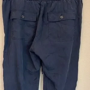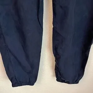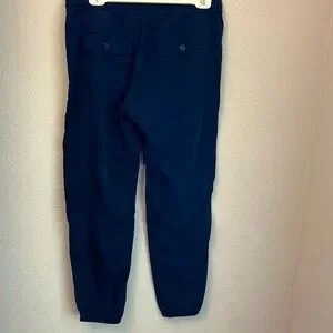 Dark blue almost black. Gathered at the ankles. Elastic waistband. Button pockets on the back. Drawstring in front. In great used condition