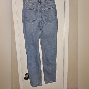 These Hollister boyfriend jeans feature a light to medium blue wash with intentional rips and a distressed look, particularly on the thighs. The straight-leg design offers a comfortable fit, making them a stylish choice for casual wear.