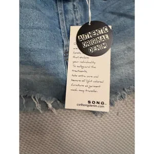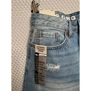 Distressed light wash denim shorts with a raw hem and relaxed fit. 7/28”, 3 inch inseam