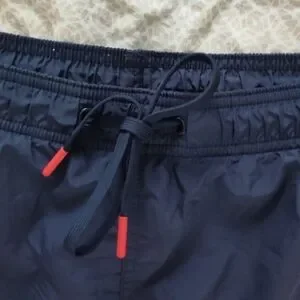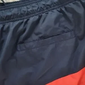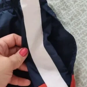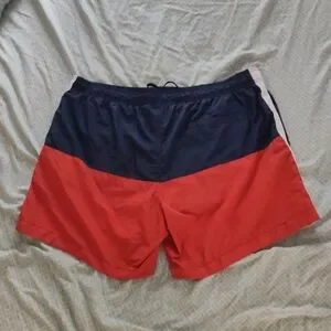 Stylish swim shorts with a red and navy colorblock design. Features white side stripes. H&M brand. Tie waist. Back Velcro pocket. Slash front pocket. 100% polyester. Machine washable.