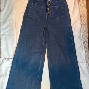 High-rise wide leg silhouette in dark blue denim. Front patch pockets and a button-front fly. Smooth, structured fabric for easy movement. Versatile style for casual or dressed-up looks.