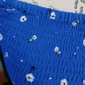 Smocked bodice with a fitted silhouette. Short puff sleeves with slight ruffle detail. Small white floral print scattered across fabric. Ruffled peplum hem adds feminine flair. Lightweight and casual for warm-weather wear.