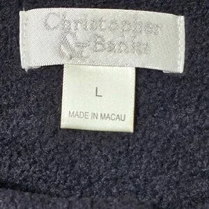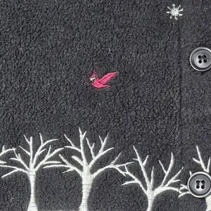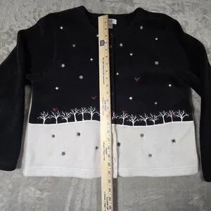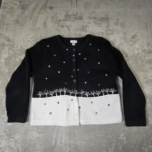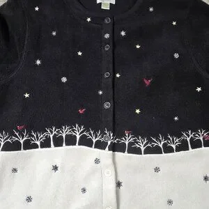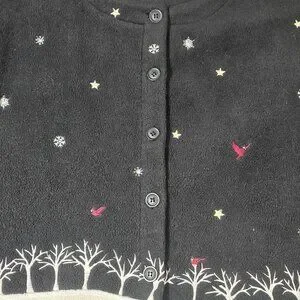 Adorable and cozy Christopher & Banks cardigan sweater featuring a charming winter scene design! This piece showcases a black upper with embroidered snowflakes and stars, plus a beautiful snowy landscape with trees and red birds along the hem. The soft fleece-like fabric makes it perfect for staying warm while still looking stylish.