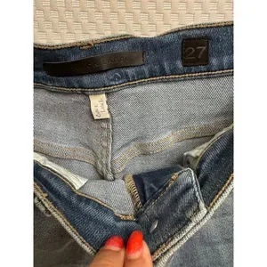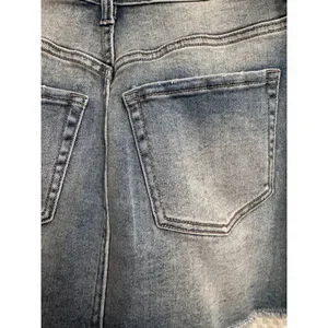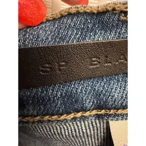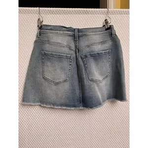 This is a women's SP Black Label blue denim mini skirt, size 27, which corresponds to a size S. The skirt features a light to medium wash with some distressed areas on the front. It has a classic five-pocket design, a front button closure with an "SP" embossed button, and a zipper fly. The hem is raw and frayed, adding to its casual style. The skirt appears to be in excellent condition, with no visible signs of wear.