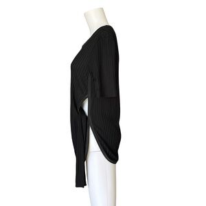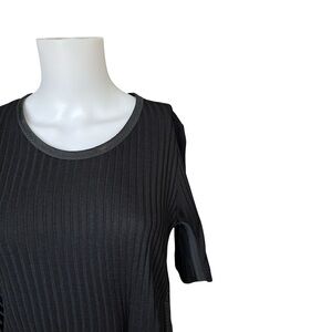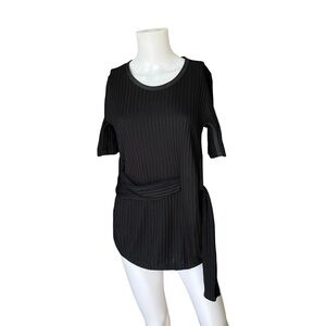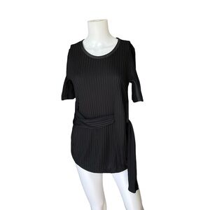 Short sleeve, round neck top in solid black. Ribbed knit throughout. Cutout at the waist where the tie portion of the top comes through. Viscose blend. Size medium
