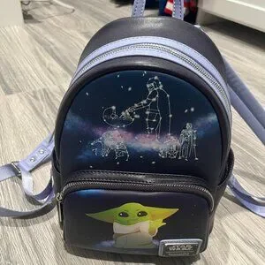 Very rare (sold out box lunch exclusive) baby yoda mini backpack with constellation pattern of Ashoka , Luke Skywalker and the Mandalorian. Glows in the dark and has beautiful colors. Gently used with no marks or stains.