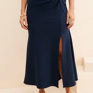 Sleeveless navy dress with a flattering side twist and front slit. Smooth, stretch fabric for comfortable all-day wear. Sleek silhouette perfect for casual or dressy occasions.