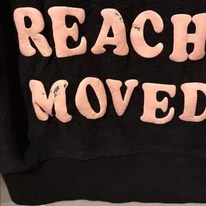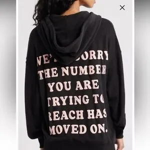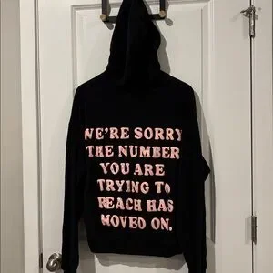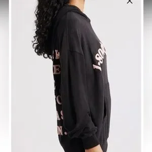 Soft black pullover hoodie with bold pink arched text on front. Kangaroo pocket and hood. Casual graphic style. Easy to layer.