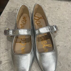 Metallic silver Mary Jane flats with a single buckle strap. Smooth leather-look upper and rounded toe. Cushioned insole for comfortable wear. Gold-tone buckle detail adds shine.