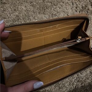 Elegant camel leather wallet with embossed pattern. Features a sleek metal logo plate.