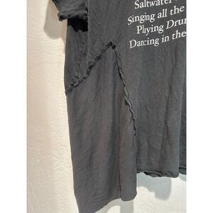 Short sleeve graphic tee showcases a unique deconstructed aesthetic with exposed raw-edge seams and a dramatic asymmetrical hemline. The front features a whimsical "This mermaid likes" list in white text against a faded charcoal gray wash. Crafted from soft 100% cotton in the USA, this piece offers a relaxed, edgy vibe perfect for casual styling.