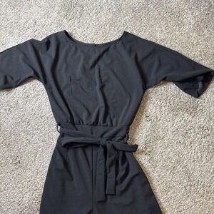 The product is a women's black short sleeve jumpsuit with a belt, in size L. It is a one-piece outfit designed for women, featuring a belted waist for a flattering silhouette. The jumpsuit is in a classic black color and short sleeves, making it versatile and easy to style for various occasions. Perfect for a casual day out or a night on the town, this jumpsuit combines comfort and style effortlessly. This jumpsuit is in excellent condition from a non-smoking home.