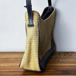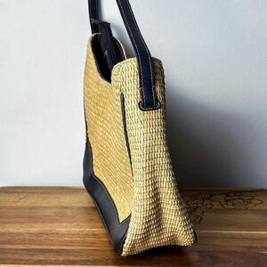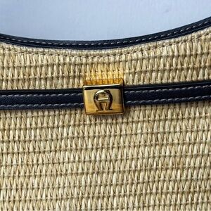 Vintage Etienne Aigner handbag featuring a structured basketweave body paired with rich navy blue leather trim and strap (approximately 24 inches long).