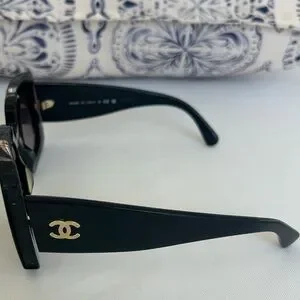 Gorgeous authentic Chanel sunglasses in classic black with gold detailing. Gray lenses with full 100% UVA/UVB protection and Category 3 UV filter. Made in Italy with high‑quality acetate for a luxe, durable feel. Compatible with prescription lenses.