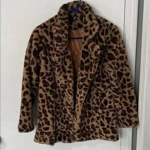 Leopard Print Faux Fur Teddy Coat Cropped Open Front Lined Size Small