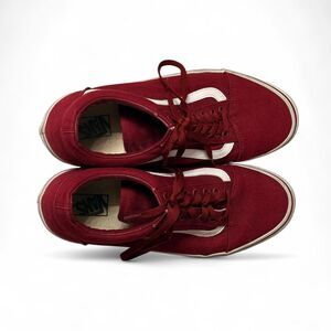 Vans Old Skool Burgundy Suede & Canvas Sneakers - Men's Size 13. Classic low-top skate shoes featuring a rich burgundy upper with durable canvas and suede construction. Signature white sidestripe, padded collar, and vulcanized rubber sole. Timeless Vans style with that perfect skater-meets-streetwear energy.