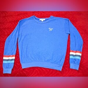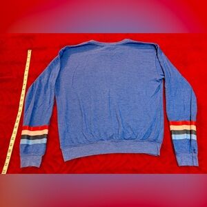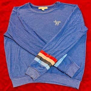 Chic blue long sleeve tee by Spiritual Gangster. Features colorful stripes on the sleeves. Ideal for casual wear. Spiritual Gangster Blue Long Sleeve Tee with Striped Sleeved.