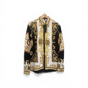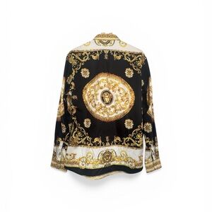 Elegant Versace blouse with intricate baroque patterns. Features striking black and gold design. Ideal for a chic look.